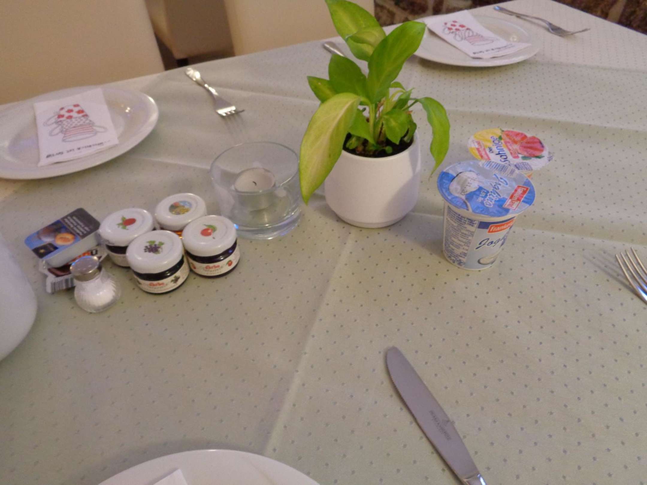 Marmelade, Honig und Joghurt stehen auf allen Tischen