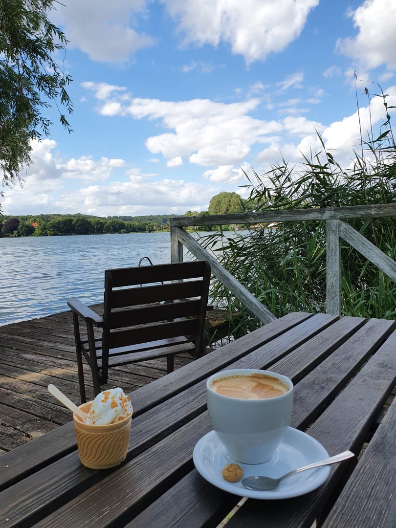 Blick auf den See von der kleinen Terrasse am Steg