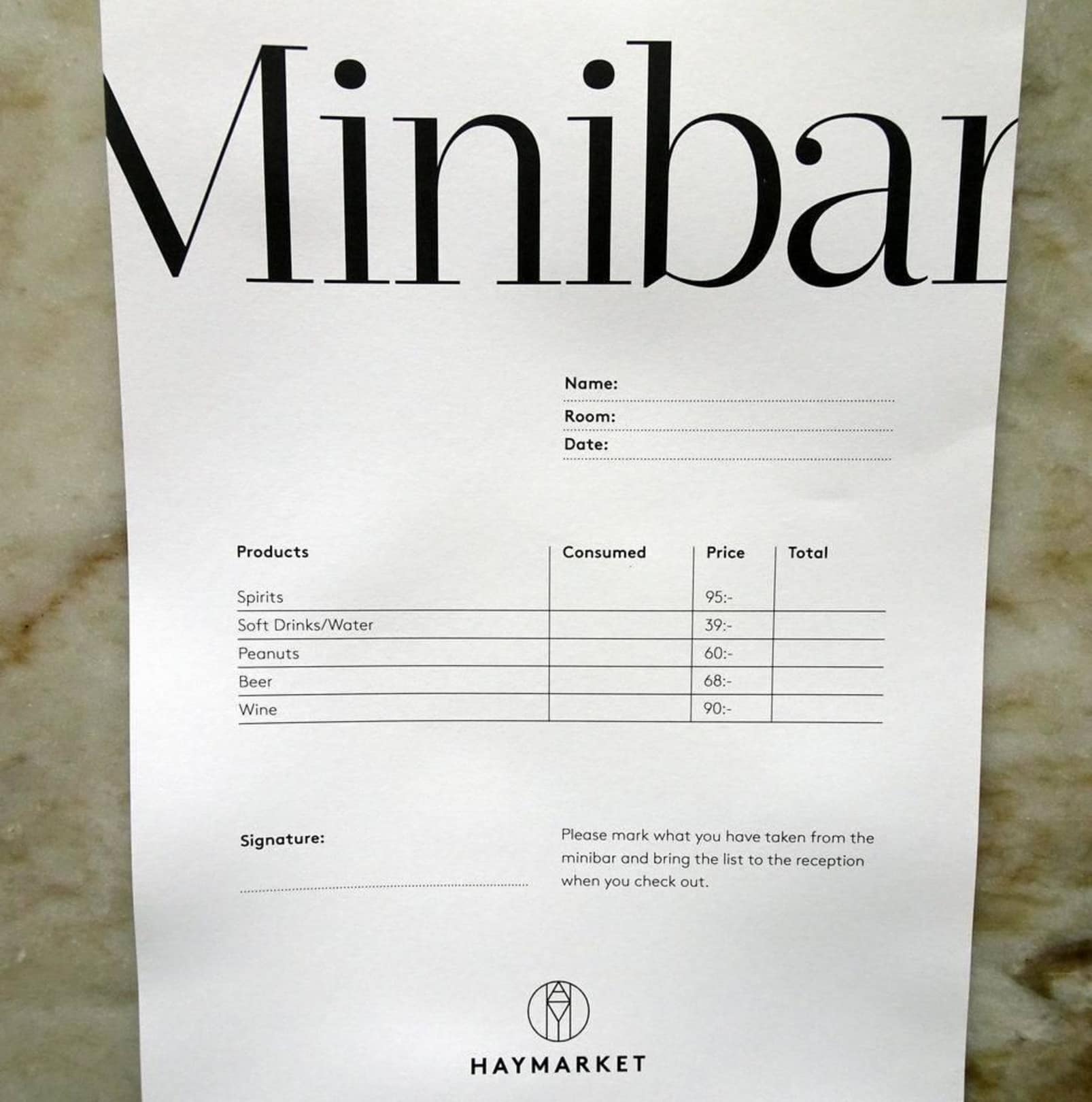 Minibar pricelist