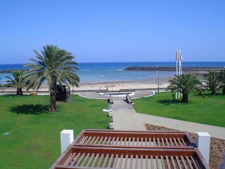 Blick vom Hauptpool zum Strand