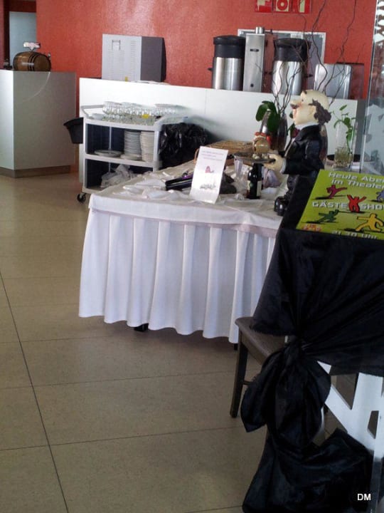 Das ist der erste Eindruck, wenn man in das Restaurant kommt, ein Ständer mit zerissendem schwarzem Stoff, eine Tisch mit Weinflaschen und die vollen Servierwagen...lecker Ein "hola" oder "Guten Abend" gab es nicht