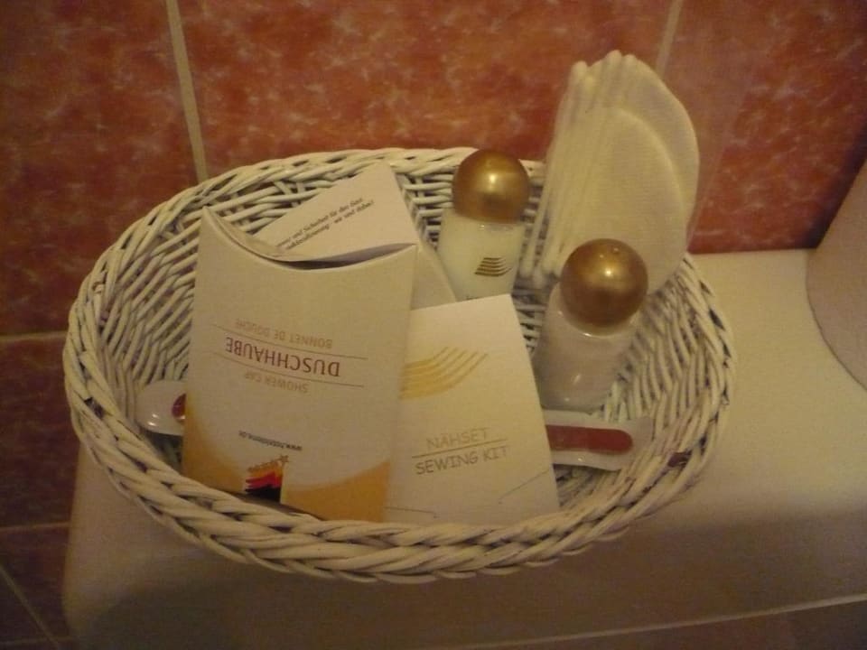 hier eine kleine Aufmerksamkeit des Hotels mit Duschgel Bodylotion Nehzeug Badeslipper Duschhaube Schuhschwamm Wattepads und Wattestäbschen Nagelfeile und Seife
