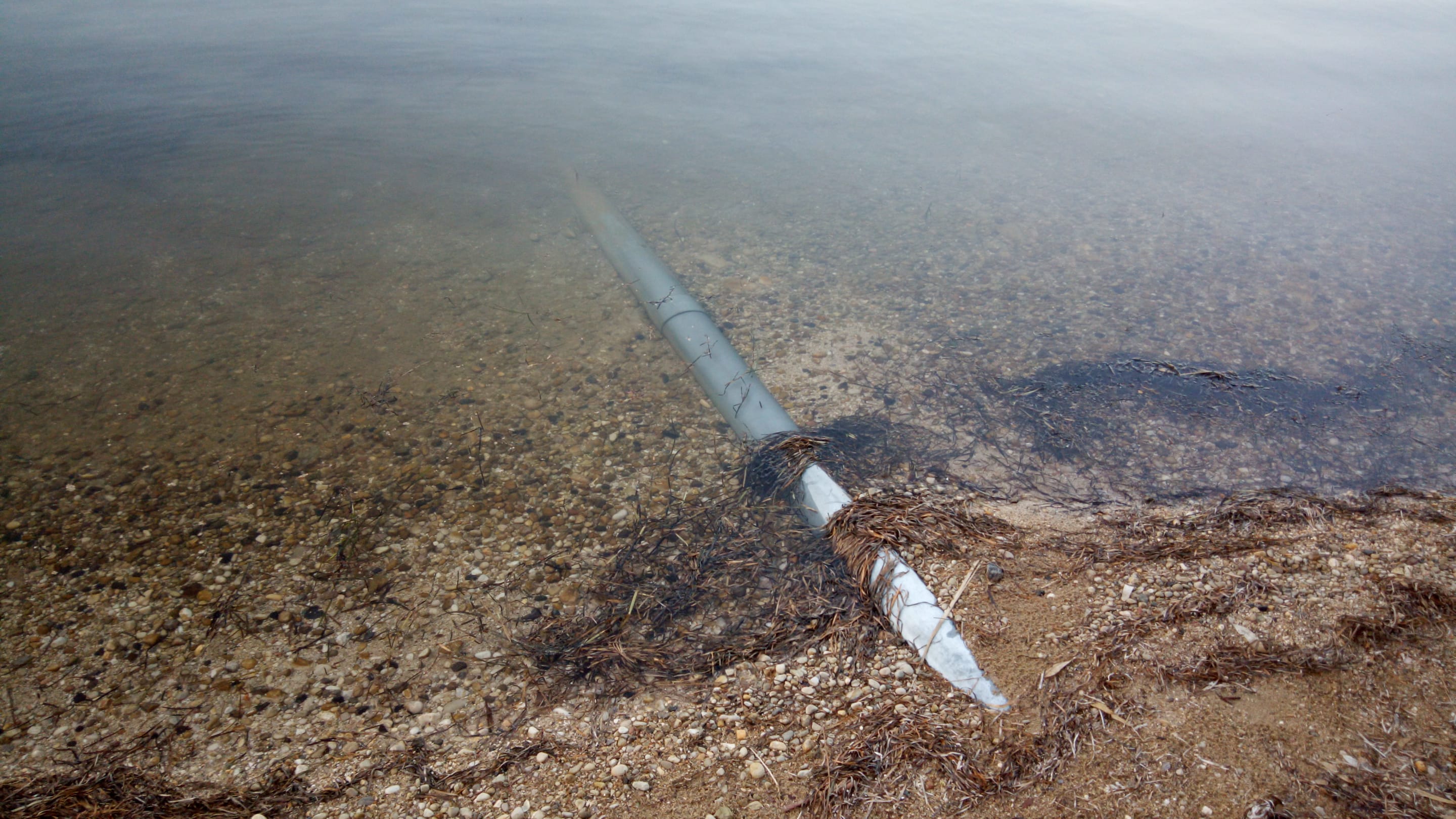 "Strand" und Wasser in Gouvia - Trüb, Schlamm, Algen, Schilf, auch ein Kanalrohr. Ein weiteres Kanalrohr mündet gemeinsam mit einem trüben Fluss...