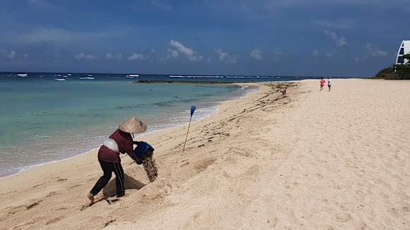 StrandHilton Mitarbeiter beim Verbuddeln von Seegras und Plastik im Sand... Müll-Entsorung auf die einfache Art!
