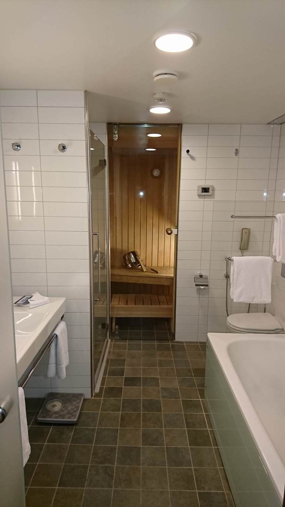 Badezimmer mit Waschbecken und Dusche (links), Badewanne (rechts) und Sauna (hinten)