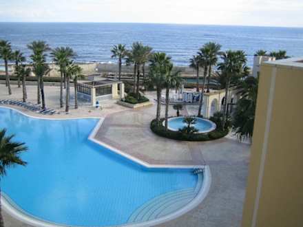 Hilton Malta, Ausblick auf den Pool und das Meer.