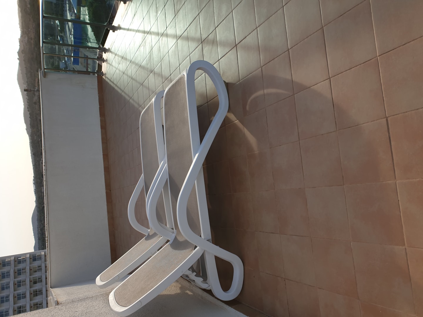 Sehr grosser Balkon mit Sitzgelegenheit und im hinteren Teil mit Liegestühlen.