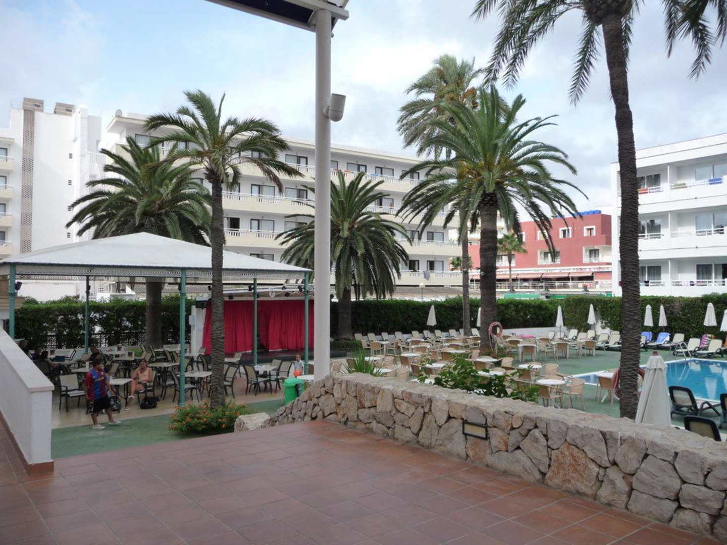 Schöne Garten- / Poolanlage. Im Hintergrund Poolbar und Showbühne