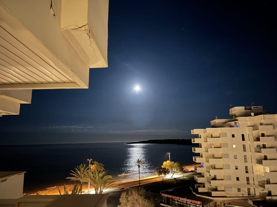 ZimmerBlick vom Balkon auf die Außenanlagen bei Mondschein.