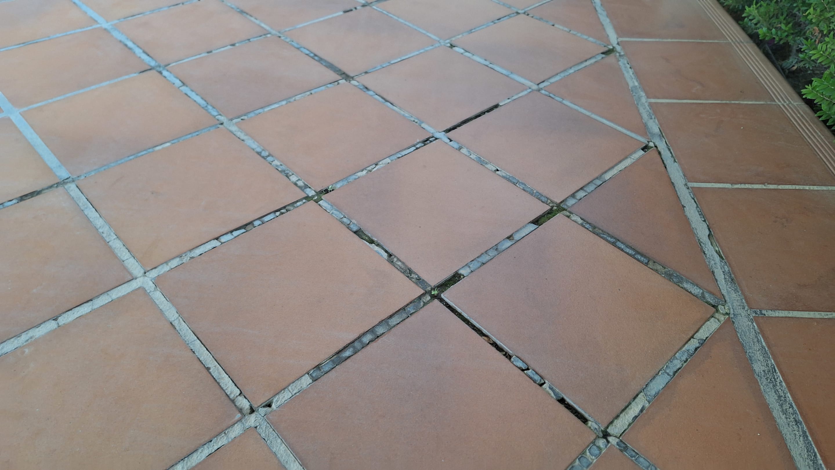 Gehweg Richtung Pool. Gut 50% der Fliesen ohne Fugenmaterial, locker oder defekt.