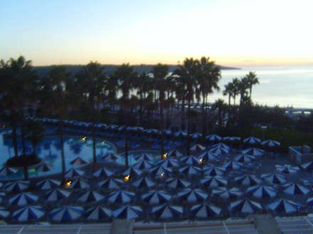 Blick vom Balkon über den Pool zum Meer