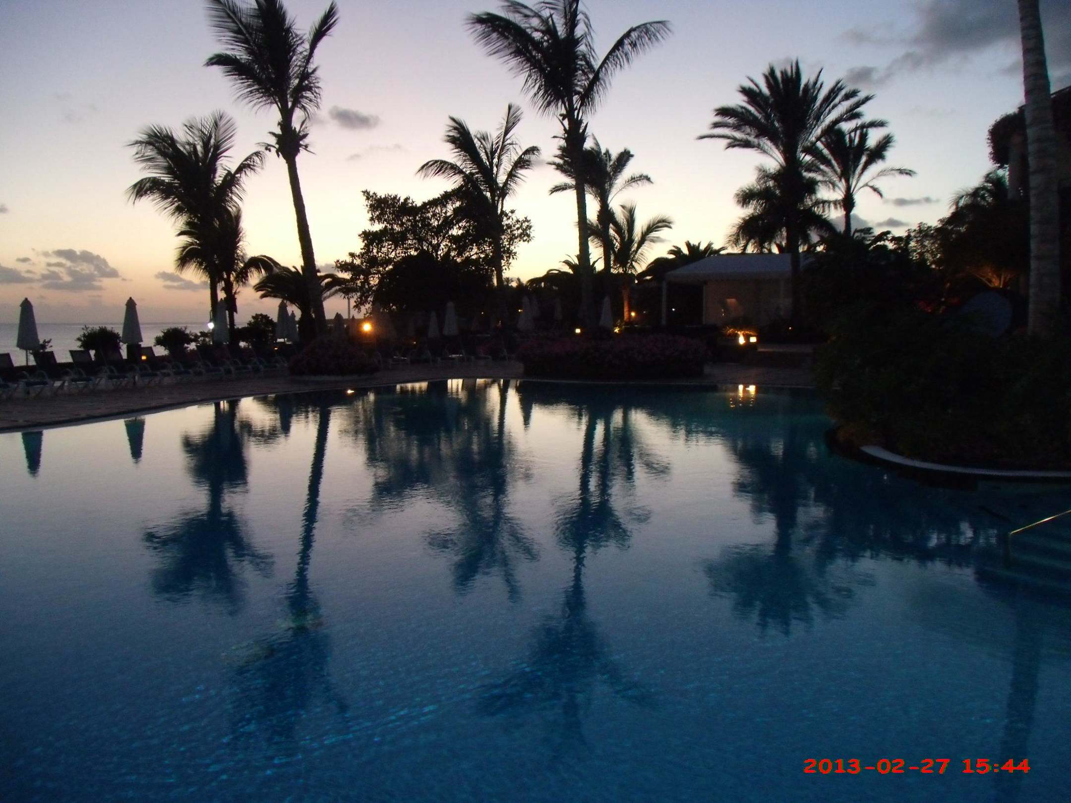 Blick auf den Hotelpool am Abend