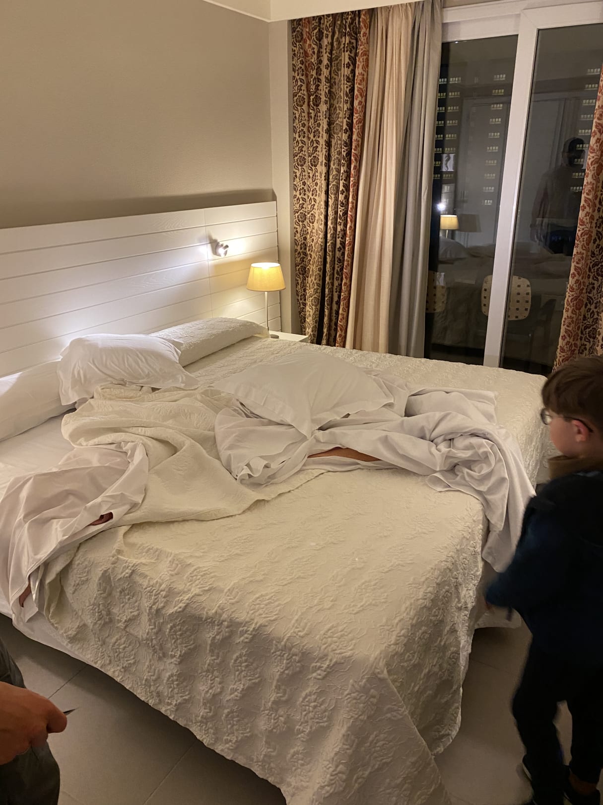 So sah unser Bett bei Ankunft aus. Da wir ein Zimmer mit zwei Einzelbetten und keines für unseren 5-jährigen Sohn hatten, wurden die Betten zusammengestellt und eine dritte Decke und Kissen draufgeworfen.