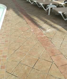 Lose und kaputte Fußbodenfliesen am Pool