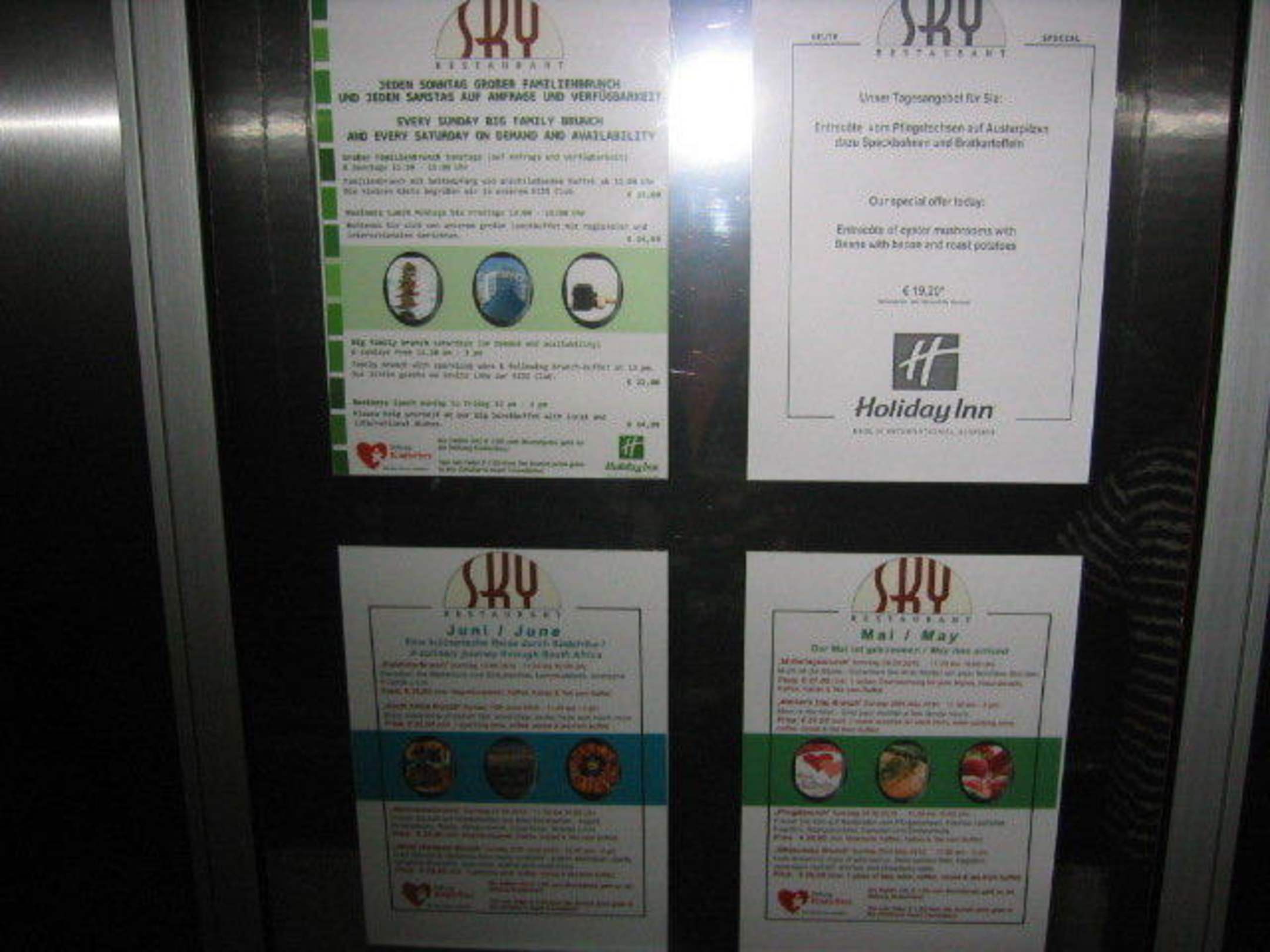 Im Lift hängen dieverse Speisekarten aus