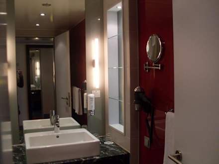 BadBad mit Dusche, großem Waschbecken, Rasierspiegel und Fön. Die Temperatur im Bad ist gut selbst regulierbar.