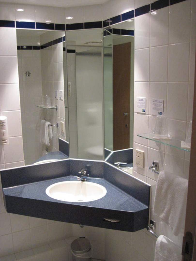 Am Eckwaschbecken hat man ausreichend Platz für die Kosmetik.