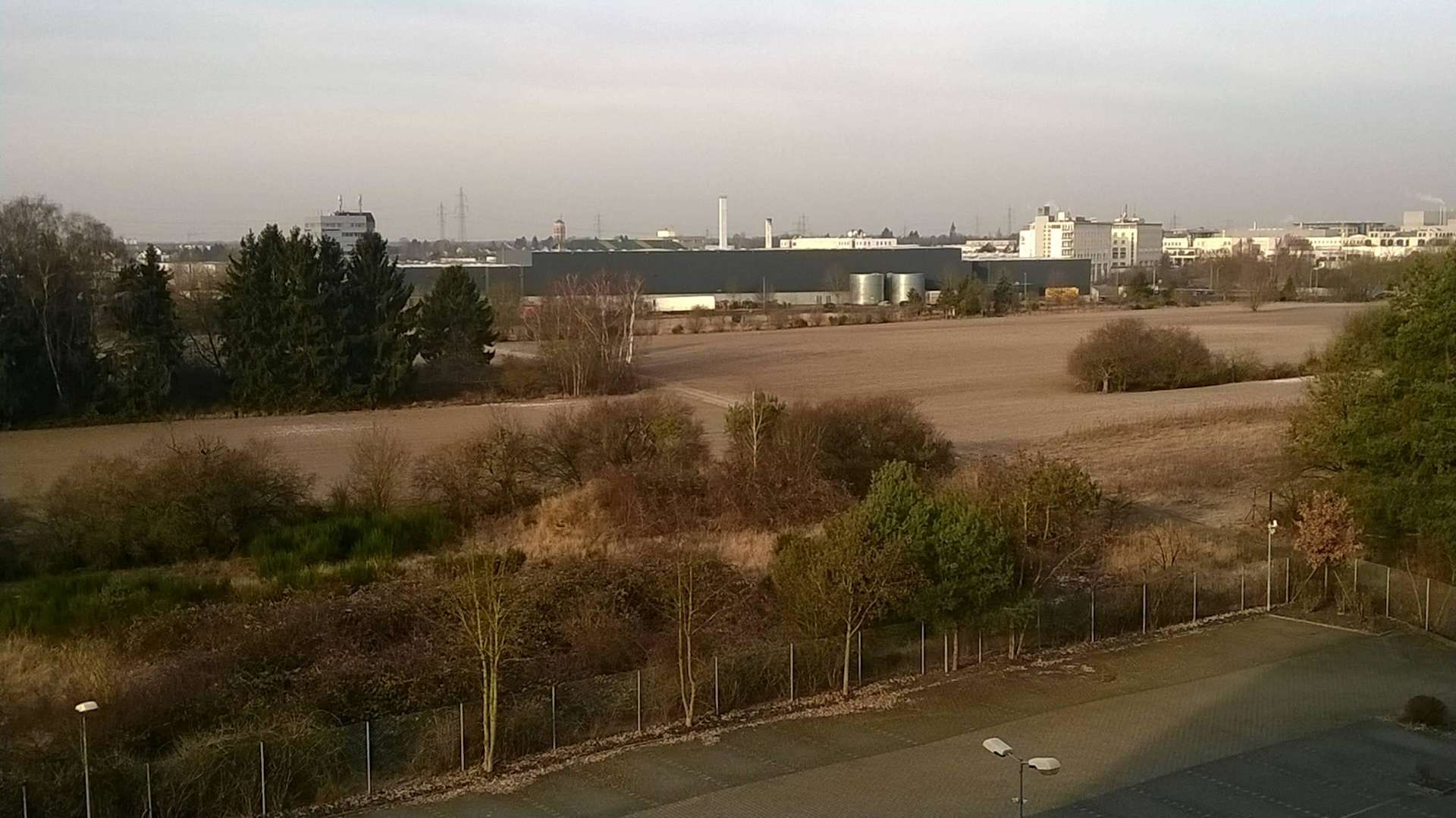 Blick über den Hotelparkplatz aus dem Zimmer in der 4. Etage. Die Zimmer auf der von der Straße abgewandten Seite sind am ruhigsten.