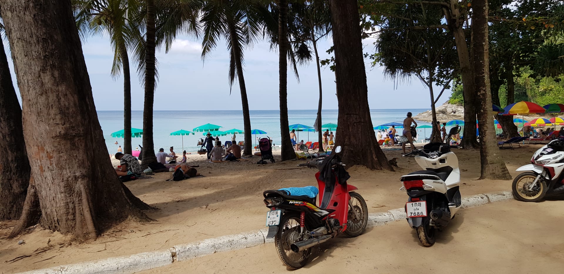 Am Strand gibt es keinen kostenlosen Schatten. Zwei Liegen mit Sonnenschirm sollen über 600 Baht kosten! Das fanden wir doch etwas viel und haben einen Platz unter den Pinien gesucht.