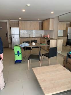 Wohnraum mit Küche und Esstisch . Sofas gibt es auch, ist aber nicht drauf auf dem Bild. Wir hatten eine Suite gebucht, da der Preisunterschied nur umgerechnet 5€ pro Tag war.