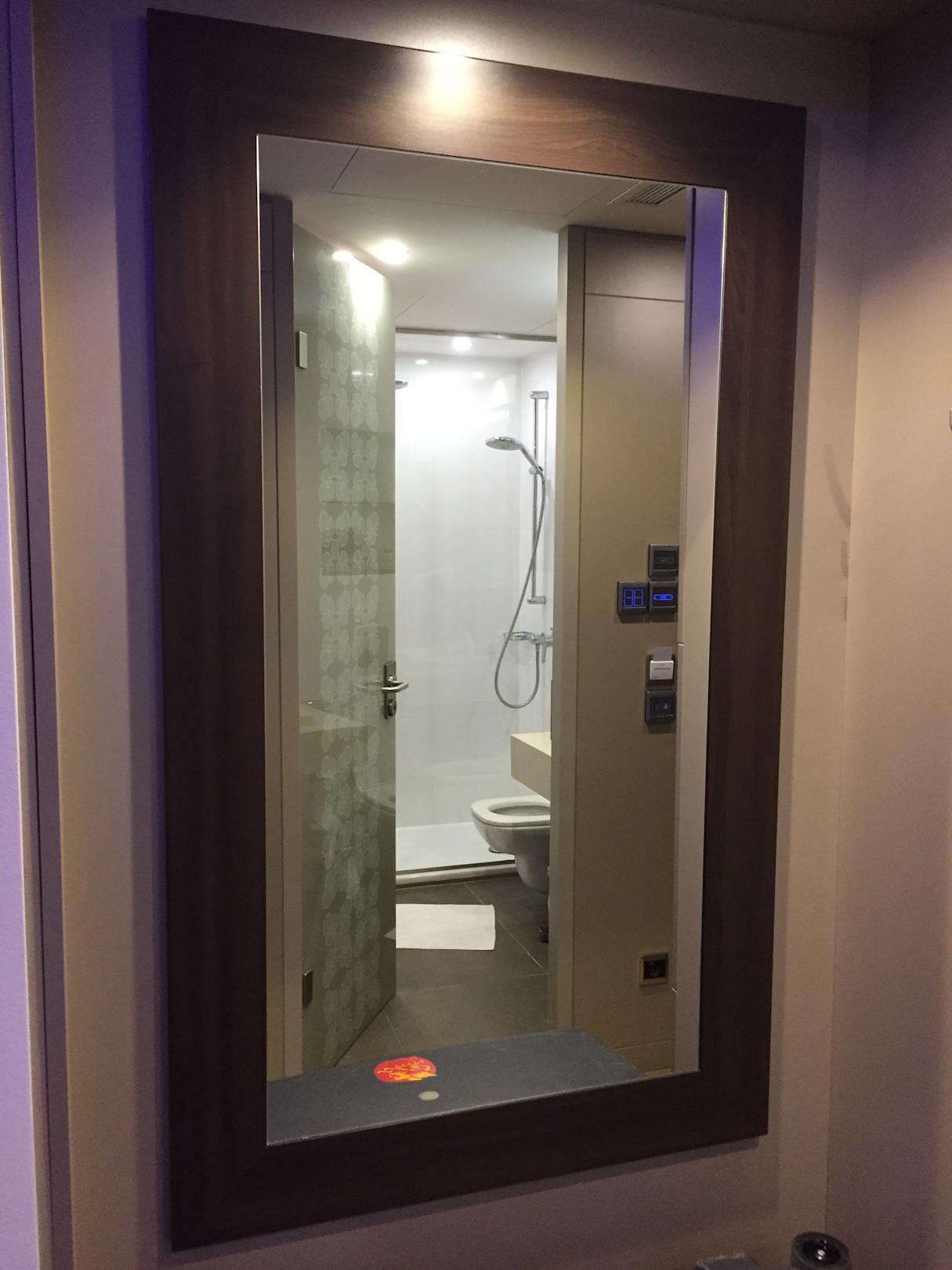 Blick ins Bad mit Glastür und Glaswand