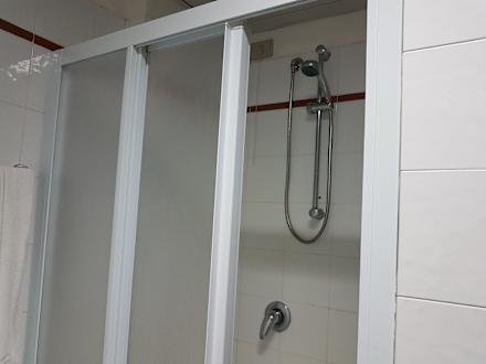 Bad im ersten Zimmer. Duschkabinie ließ sich nur ohne Gewalt bis dort zuziehen.