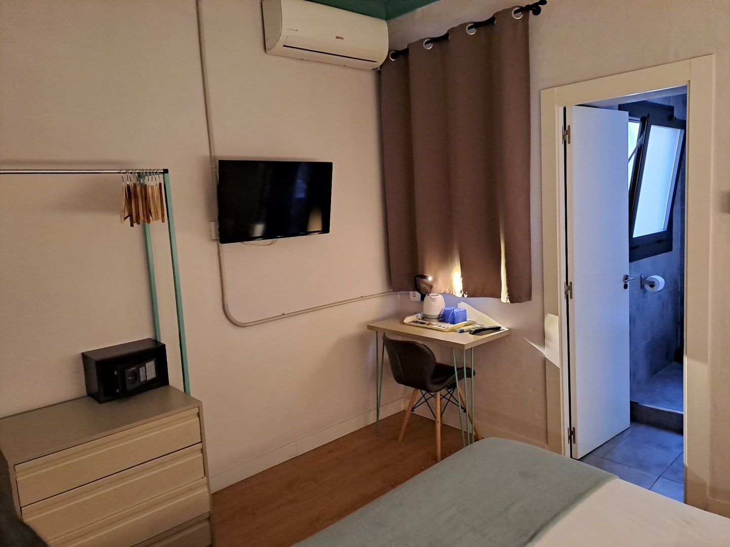 Zimmer vom Bett aus, rechts geht es ins Bad