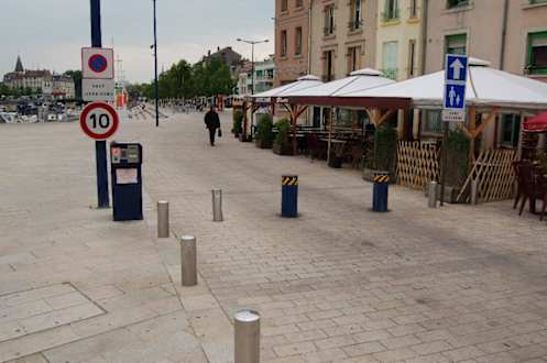 Die versenkbare BarriereBlick auf die versenkbare Barriere, die die Zufahrt zum Hotel blockiert. An dem Terminal links wählt man am rechten Panel aus einer Liste das Hotel Coq Hardi aus und drückt den Klingelknopf. Daraufhin wird eine Verbindung zum Hotel aufgebaut.