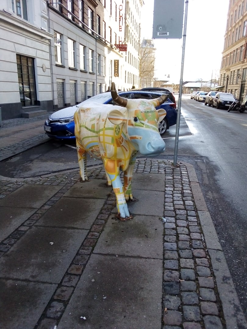 Landkartenkuh vor dem Hotel