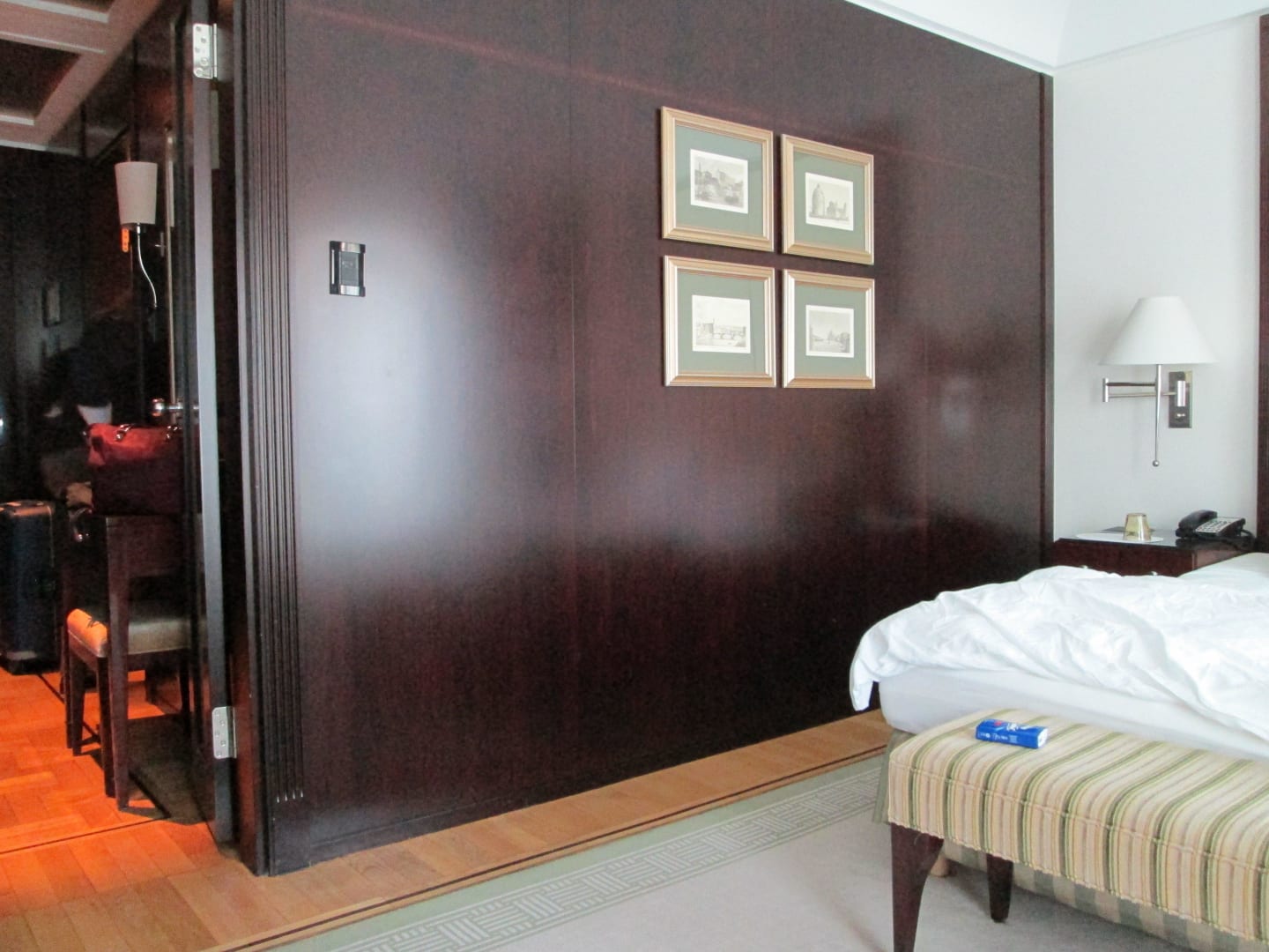 Hinter der Edelholz-Paneelwand verbirgt sich der große Sanitärkomplex; links der Korridor mit offener Doppelflügeltür.
