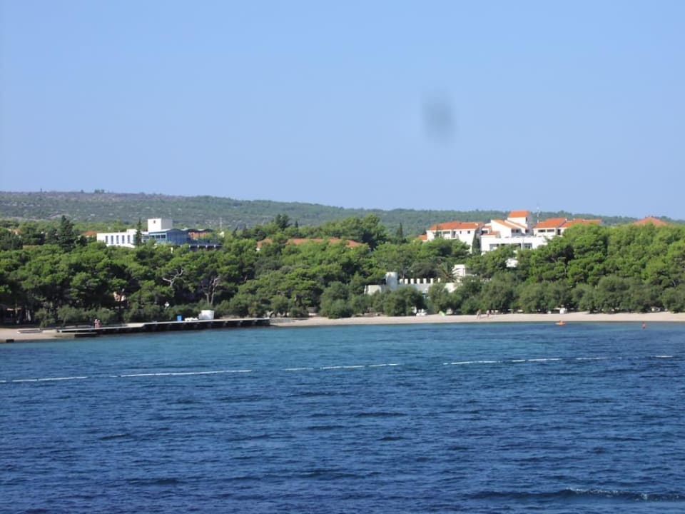 Strand - BadebuchtDie Badebucht von Supetar. Die Gebäude Mitte-Links ist der Adria Club. Mittig, das was eine Burg aussieht, ist schon die Poolanlage Entfernung ca. 30m vom Strand. Im Vordergrund ist die schwimmende Abgrenzung der seichten Badebucht zu sehen ( weiße Linie ) dahinter beginnt dann das tiefere Wasser.