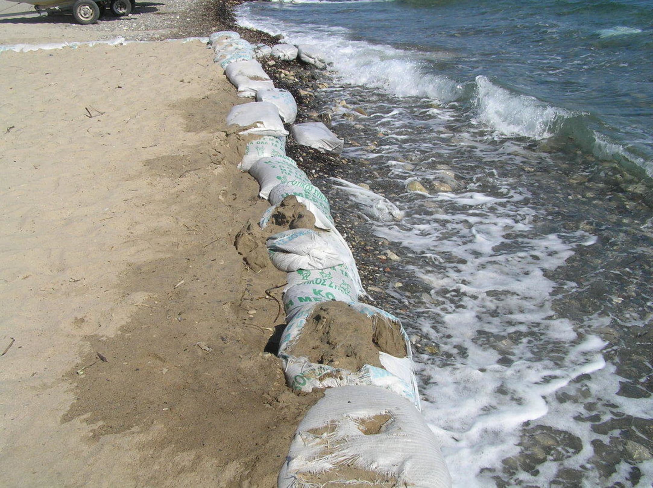 Das Bild zeigt den angebotenen Hotelstrand, eine mit Sand aufgeschüttete Fläche, die von aufgeplatzten Sandsäcken umrahmt wird. Der Zugang zum Wasser ist wegen der Steine so gut wie nicht möglich.