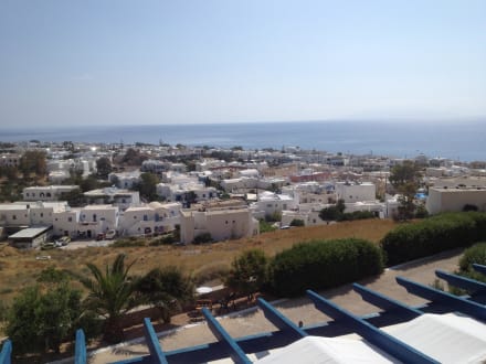 Blick vom Zimmer auf Kamari und den Strand