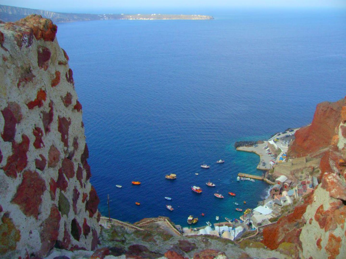 schöner Blick auf den kleinen Hafen Oia