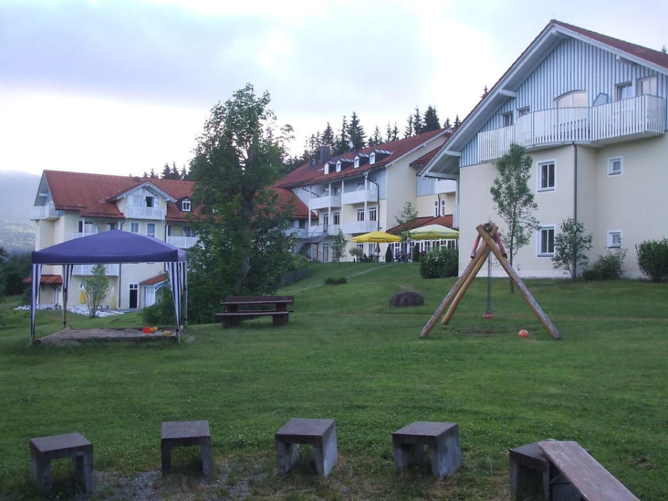 Diese Aufnahme entstand am frühen Morgen des 17. Juni 2010. Sie zeigt die Westseite des Ahornhofs von einer seit Mai 2008 im Garten des Hotels angelegten Feuerstelle her.