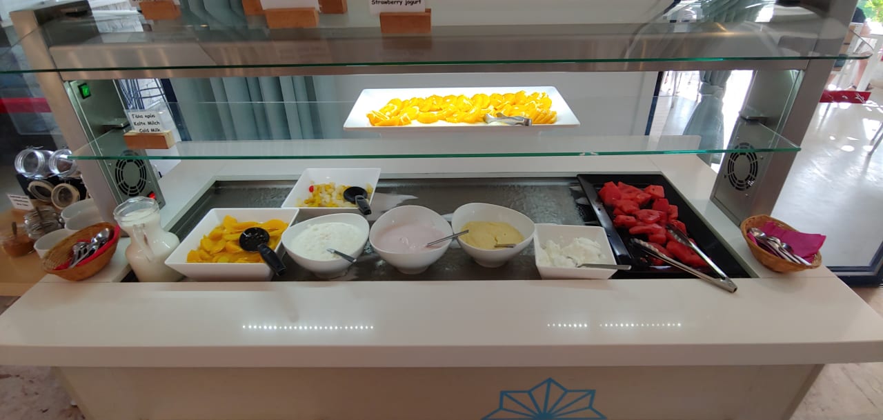 Nachtisch Buffet Dosenpfirsiche, Dosen Fruchtcoctail, Yogurt, Wassermelone und Orangen. Manchmal gibt es Kuchen, aber das ist das ganze Nachtisch Buffet !