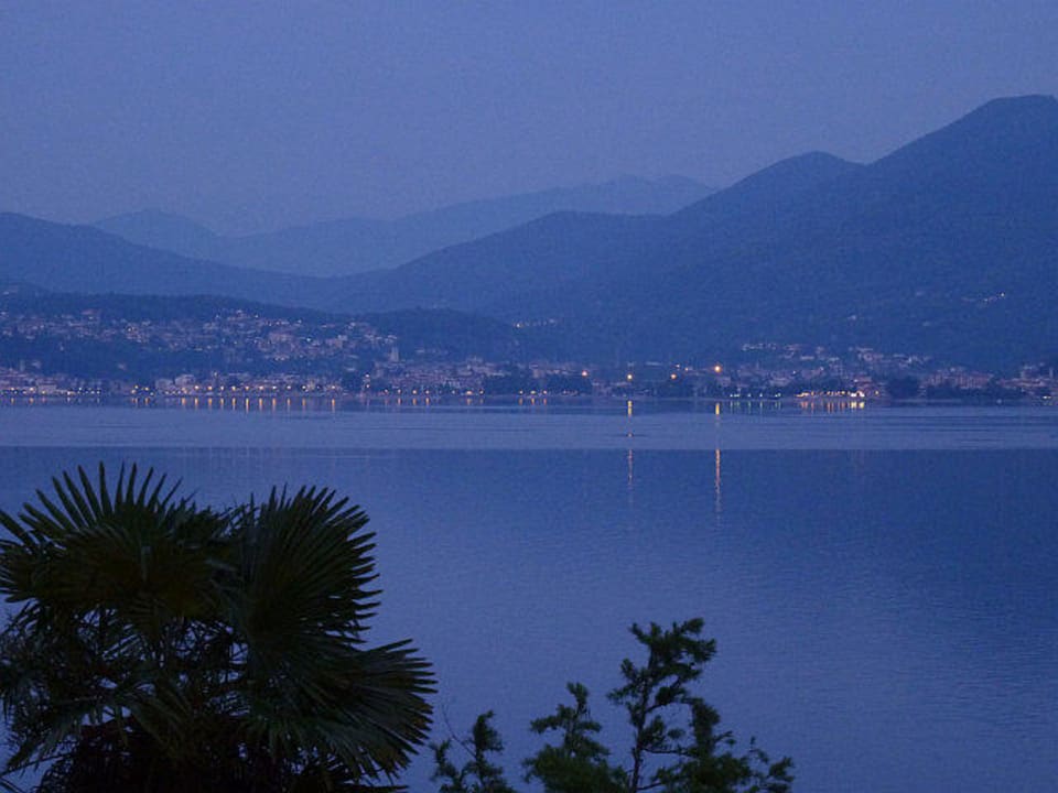 Blick vom Balkon auf den See und das gegenüberliegende Ufer mit dem Ort Luino