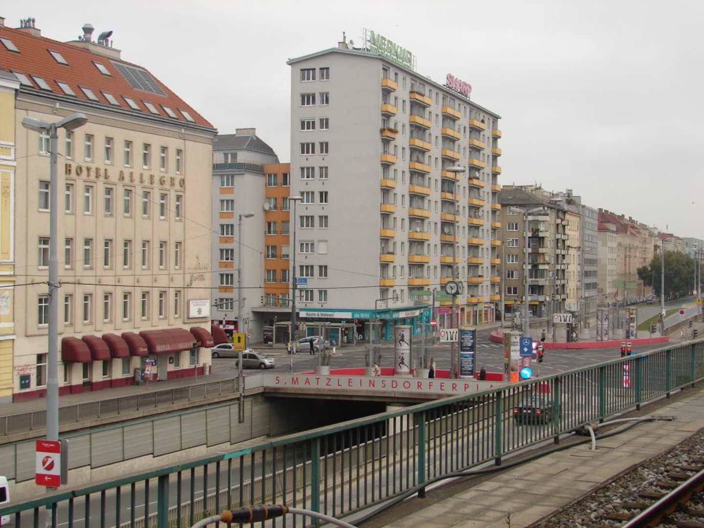 Teil der Straßenkreuzung vor dem Hotel. Die andere Richtungsfahrbahn liegt hinter den Gleisen!