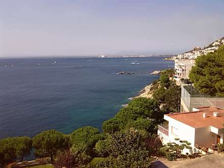 Blick vom Balkon auf der Westseite (bester Panoramablick !) auf die große Bucht von Roses, morgens.