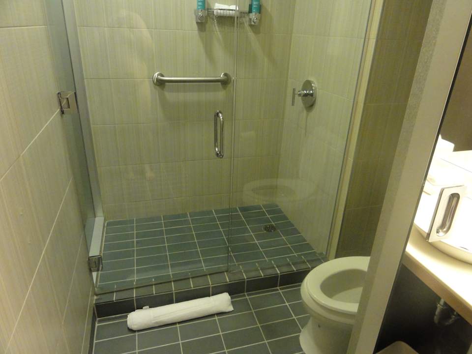 Rechts hinter dem beweglichem Spiegel das Klo hinten die Duschkabine