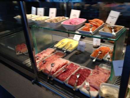 Wurst und Fisch in einer Kühlvitrine, keine Deko oder dergleichen.