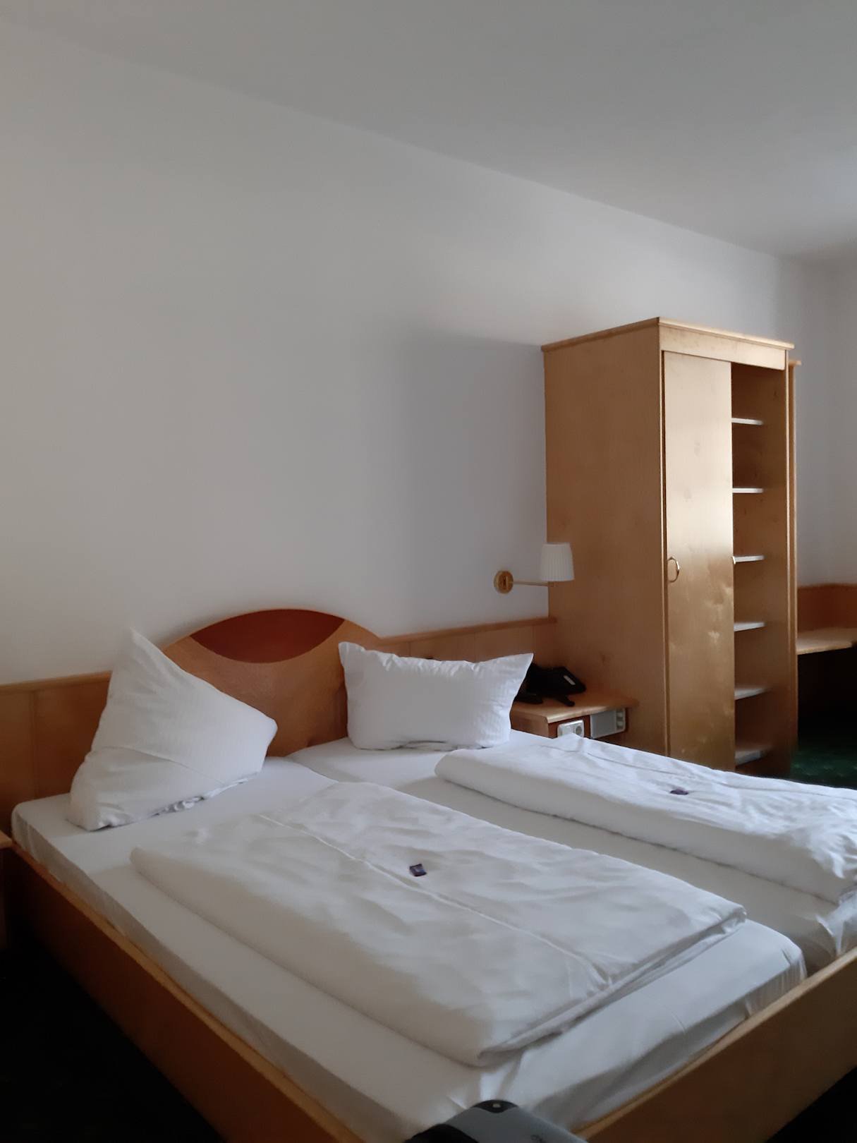 Zimmer 201. Doppelbett und Kleiderschrank