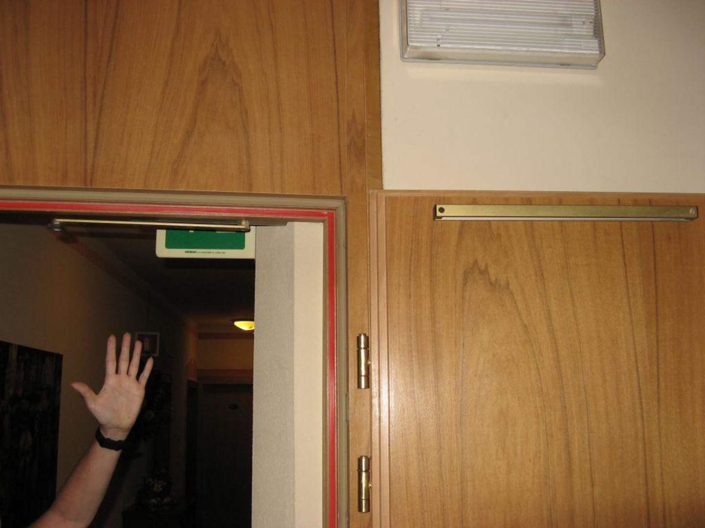 Ausgehängter Auslösehebel der Feuerschutztür zu den Gästezimmern