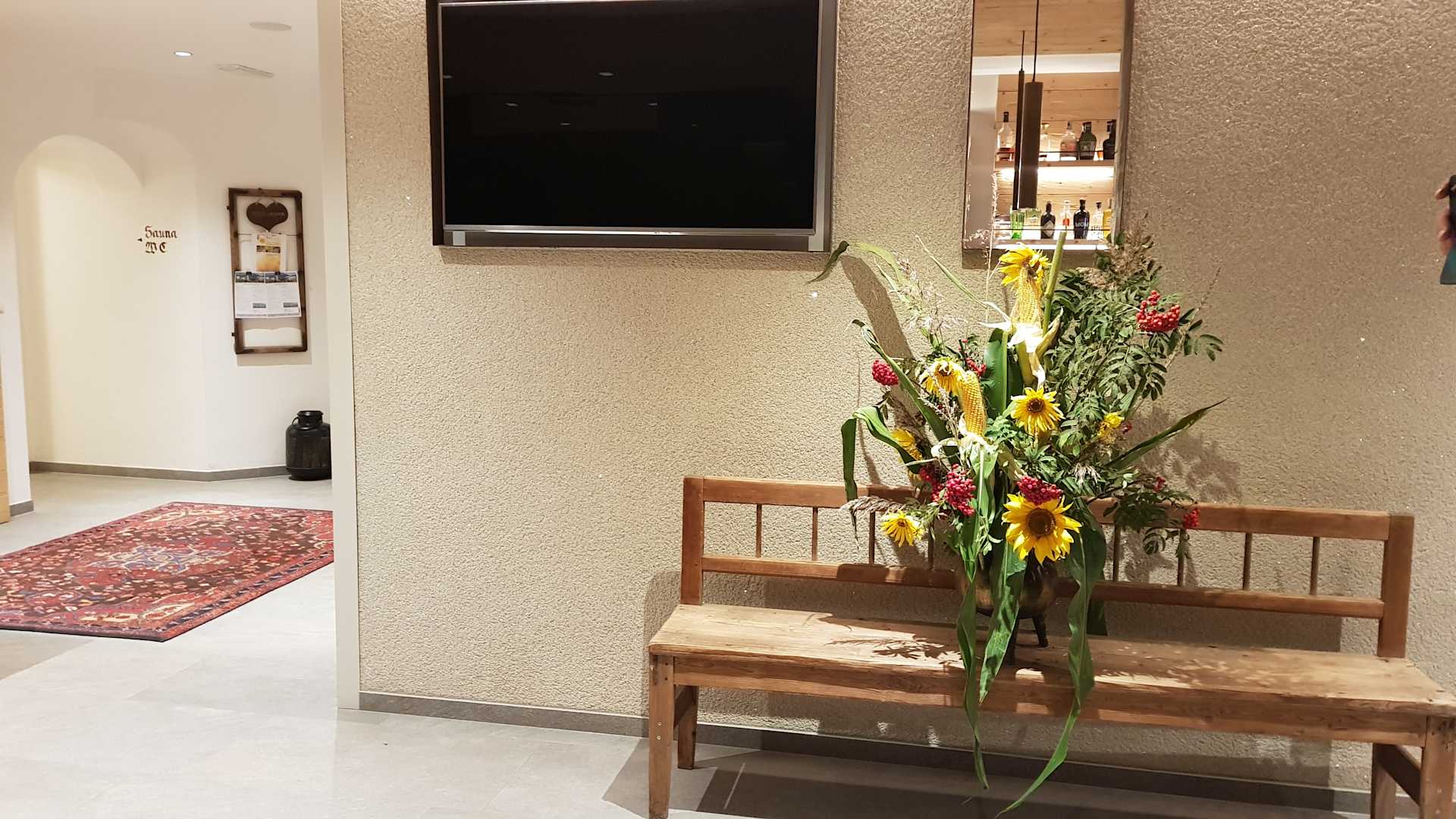Schön dekorierter Eingangsbereich - links der LCD TV mit dem Tagesmenü