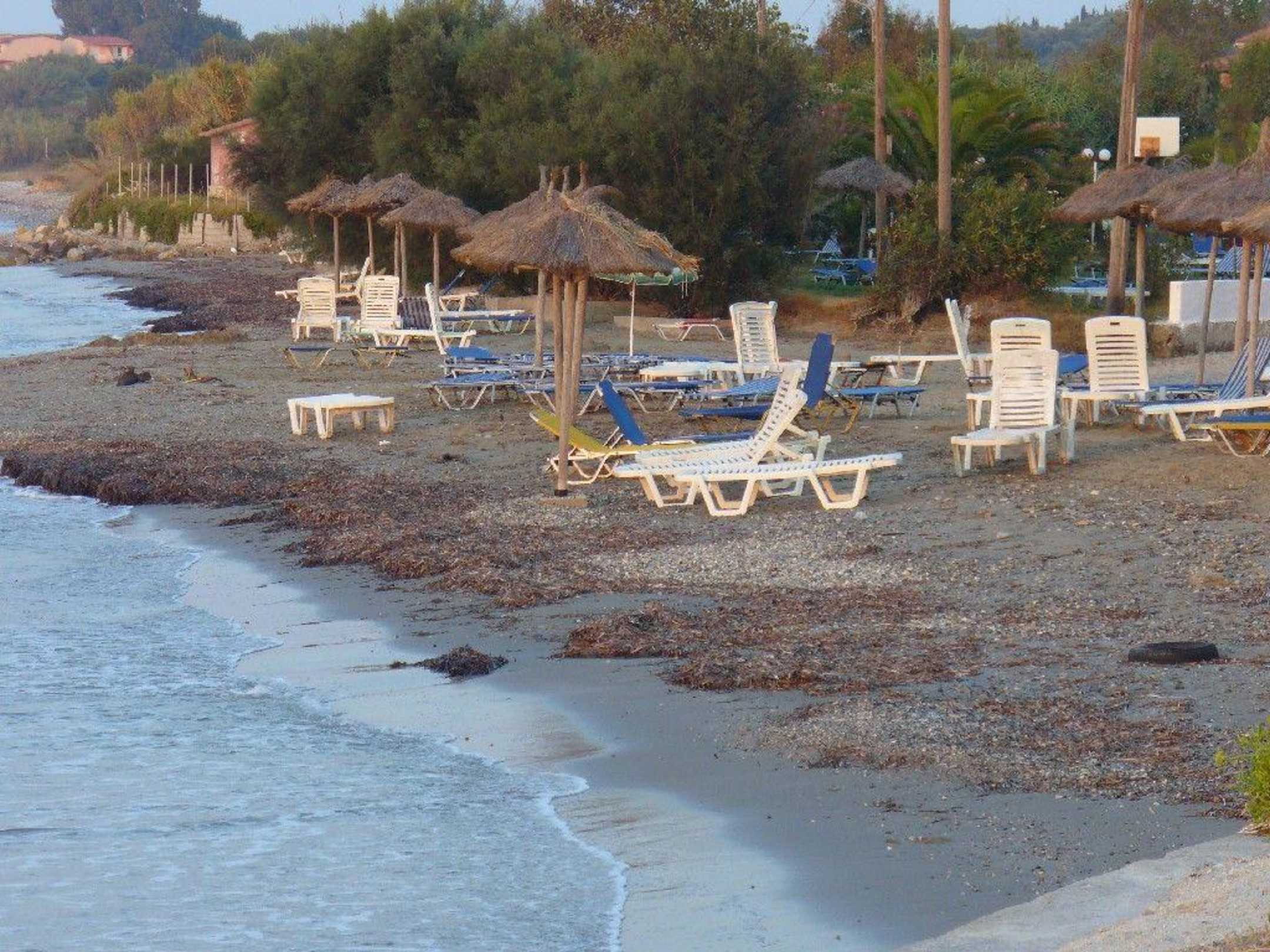Der HotelstrandKorfu - Astrakeri - Hotel Angela Beach: Der schmale und nicht sonderlich gepflegte Strand vor dem Hotel.
