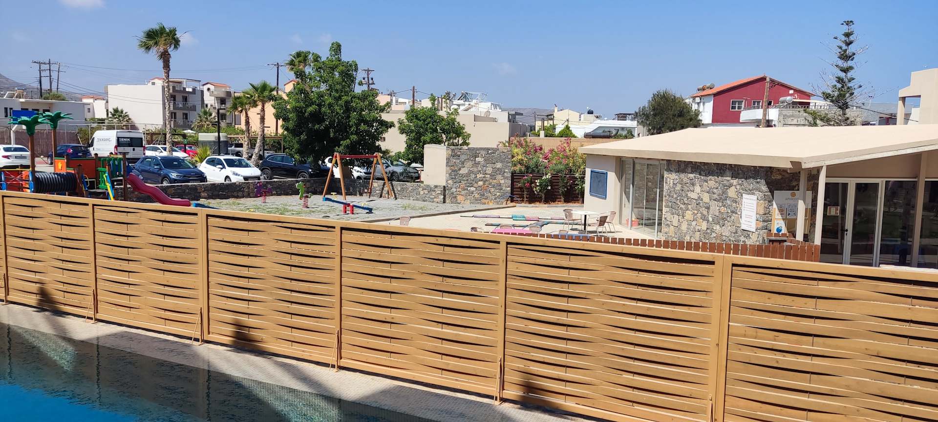 Doppelzimmer Deluxe Sharingpool Adult Only. Blick von der Terrasse zum Kinderspielplatz