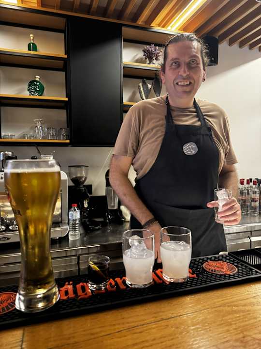Großes Bier, kleines Cola und 2 Raki, super netter und lustiger Barkeeper