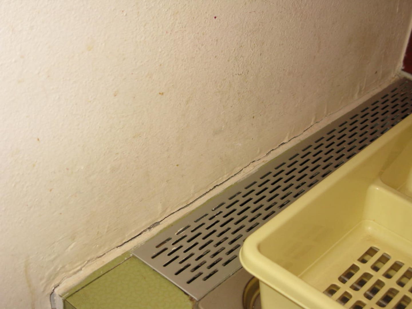 Waschbeckenbereich: verdreckte Wände, aufgeplatzte Fugen