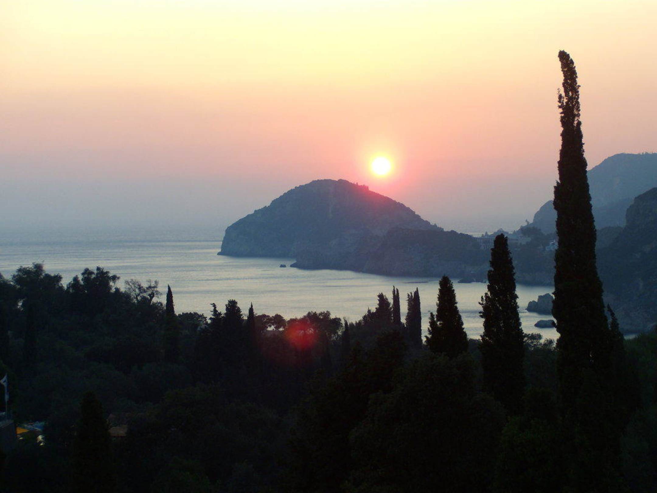 Arias HotelAusblick vom Zimmer des oberen Stockwerks des Liapades Hotels auf den Sonnenuntergang über der Liapades Bucht. (Korfu)