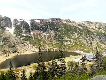 Ansicht von "Maly Staw" mit der Berghütte "Samotnia"